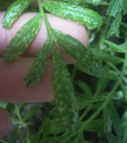 Si les tâches blanches forment un léger feutrage, il s'agit d'un oïdium. Cela se traite avec un fongicide, classiquement avec des pulvérisations de soufre. Cela se produit sur les plantes dans une atmosphère trop humide, causée par un arrosage excessif (y compris la pluie), une température un peu basse, un manque de ventilation, ou un manque d'ensoleillement. |